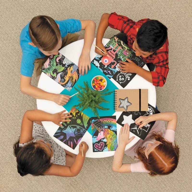 It’s easy to create incredible works of art with the 4 guided illustrations that are super easy for kids to follow. Or use your imagination to scratch your own design onto the 2 rainbow cards or the 2 sparkle cards; the rainbow & sparkle are hidden until you scratch in your design.